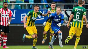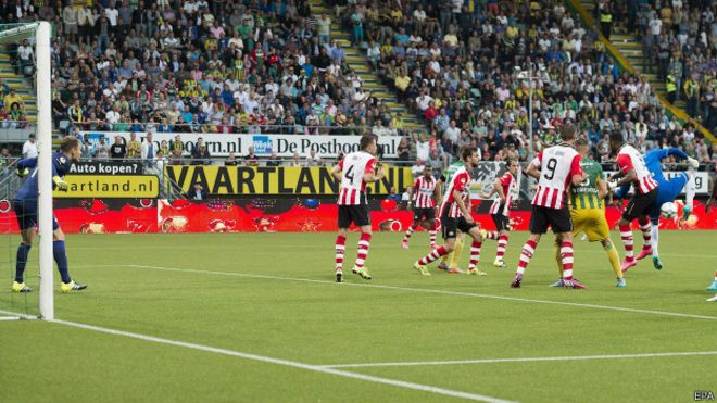 El portero danés Martin Hansen anotó un espectacular gol de "espuela" en el minuto 95 del partido entre su equipo, el ADO Den Haag, y el actual campeón de la liga holandesa, el PSV Eindhoven.